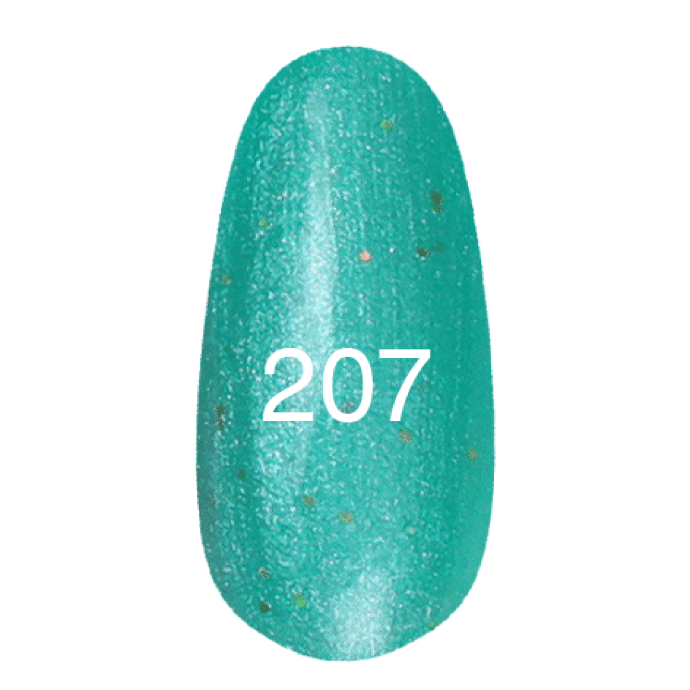 Гель-лак № 207 имеет свежий бирюзовый цвет с перламутром. Рекомендуется покрытие двумя тонкими равномерными слоями с полимеризацией каждого слоя 120 секунд в УФ лампе или 30 секунд в LED лампе.
