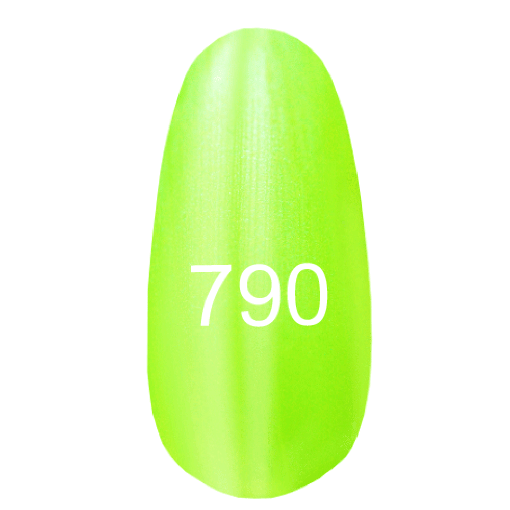 Гель-лак №790 относится к летней жемчужной коллекции, которая отличается наличием перламутра. Гель-лак имеет яркий желто-зеленый цвет. Блик соответствует оттенку гель-лака. Не рекомендуется применять в сочетании с подложкой темного цвета.