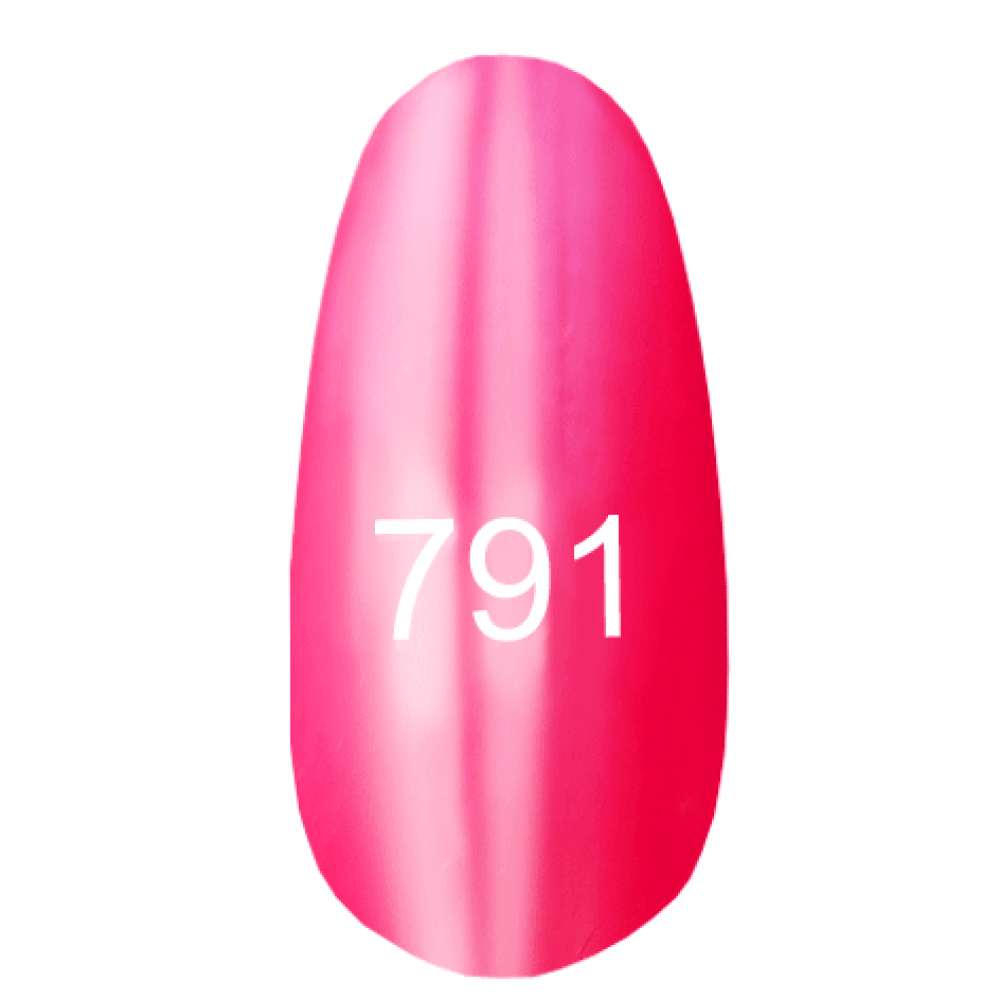 Гель-лак №791 относится к летней жемчужной коллекции, которая отличается наличием перламутра. Гель-лак имеет яркий ярко-розовый цвет. Блик соответствует оттенку гель-лака. Не рекомендуется применять в сочетании с подложкой темного цвета.