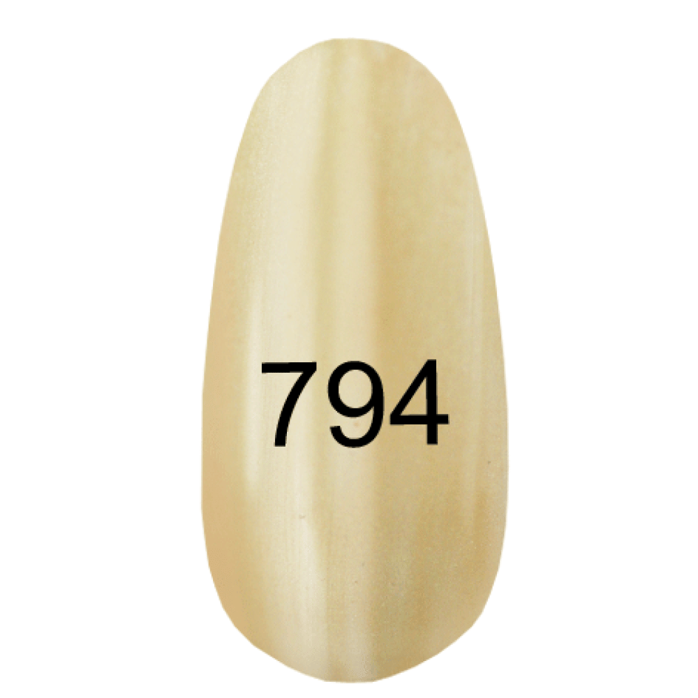 Гель-лак №794 относится к летней жемчужной коллекции, которая отличается наличием перламутра. Гель-лак имеет жемчужный кремовый цвет. Блик соответствует оттенку гель-лака. Не рекомендуется применять в сочетании с подложкой темного цвета.