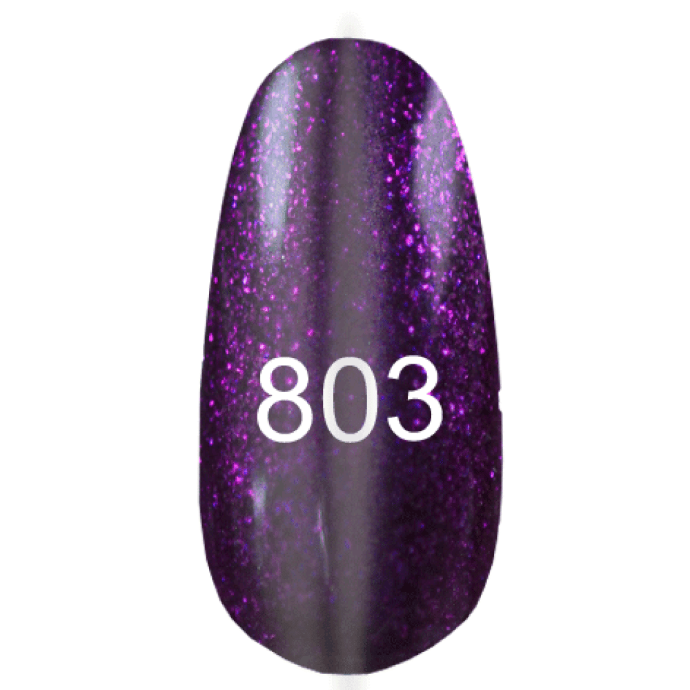 Гель-лак №803 относится к сегменту Gold Shimmerв составе коллекции «Moon light», который отличается бликом золотистого цвета. Гель-лак имеет насыщенный фиолетовый цвет с синим шиммером.