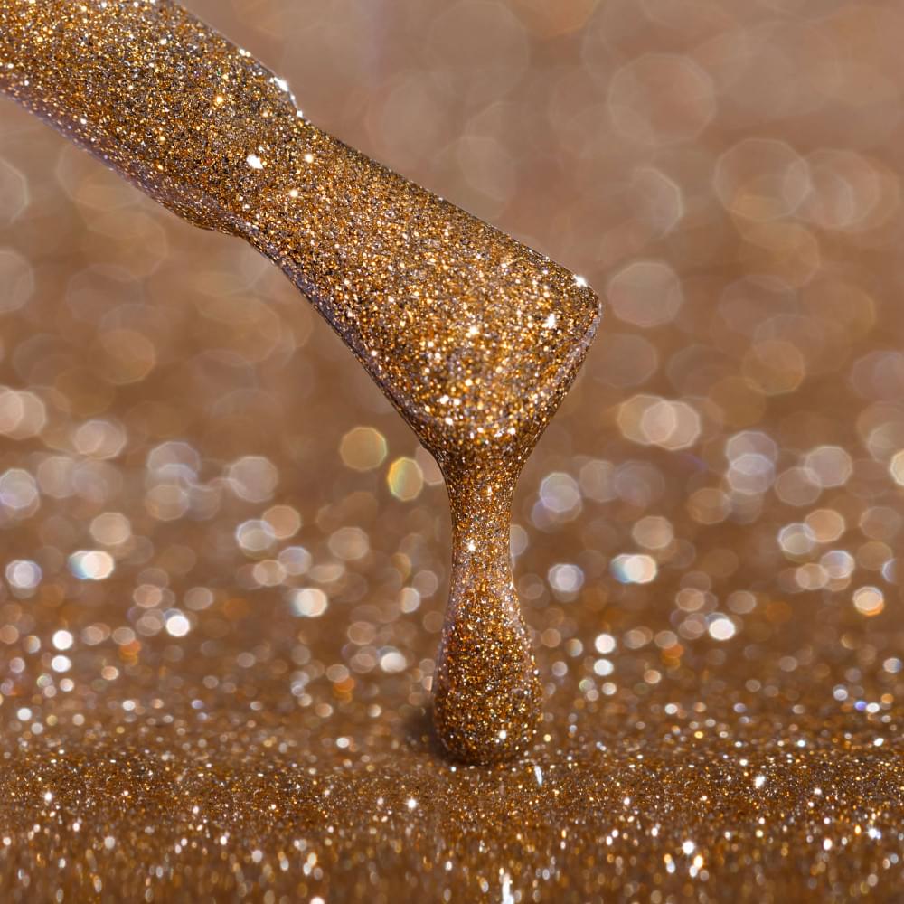 Гель-лак № 04DS: прозрачная основа с мерцающими частицами золотого цвета.