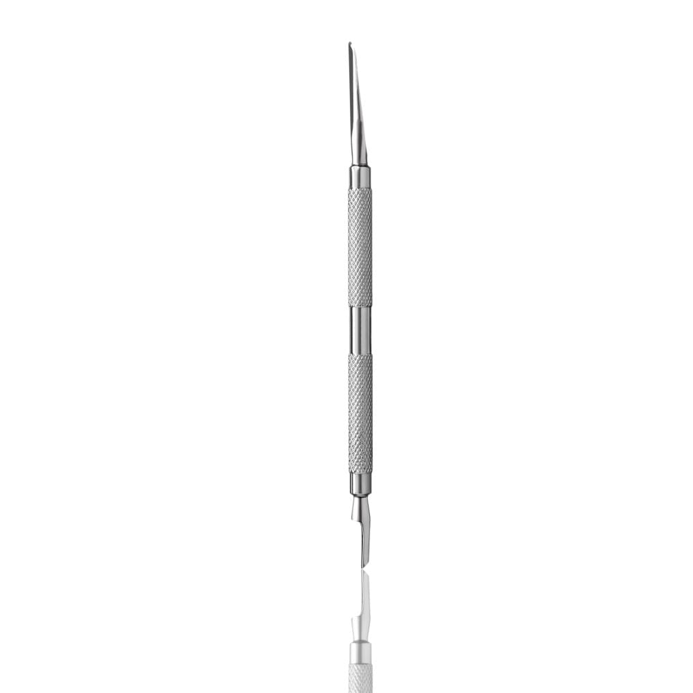 Пушер имеет два рабочих полотна: скошенная лопатка подойдет для деликатного отодвигания кутикулы, а также закрепления на ней файла нужного абразива. На второй стороне расположен скошенный шабер, которым легко убрать остатки кутикулы на поверхности ногтей и из-под проксимальной складки. Ручка со специальной рифленой насечкой удобно фиксируется в ладони и не выскальзывает во время работы. Инструмент изготовлен из качественного и износостойкого материала, устойчивого к коррозии — нержавеющей стали. Подлежит стерилизации и дезинфекции.