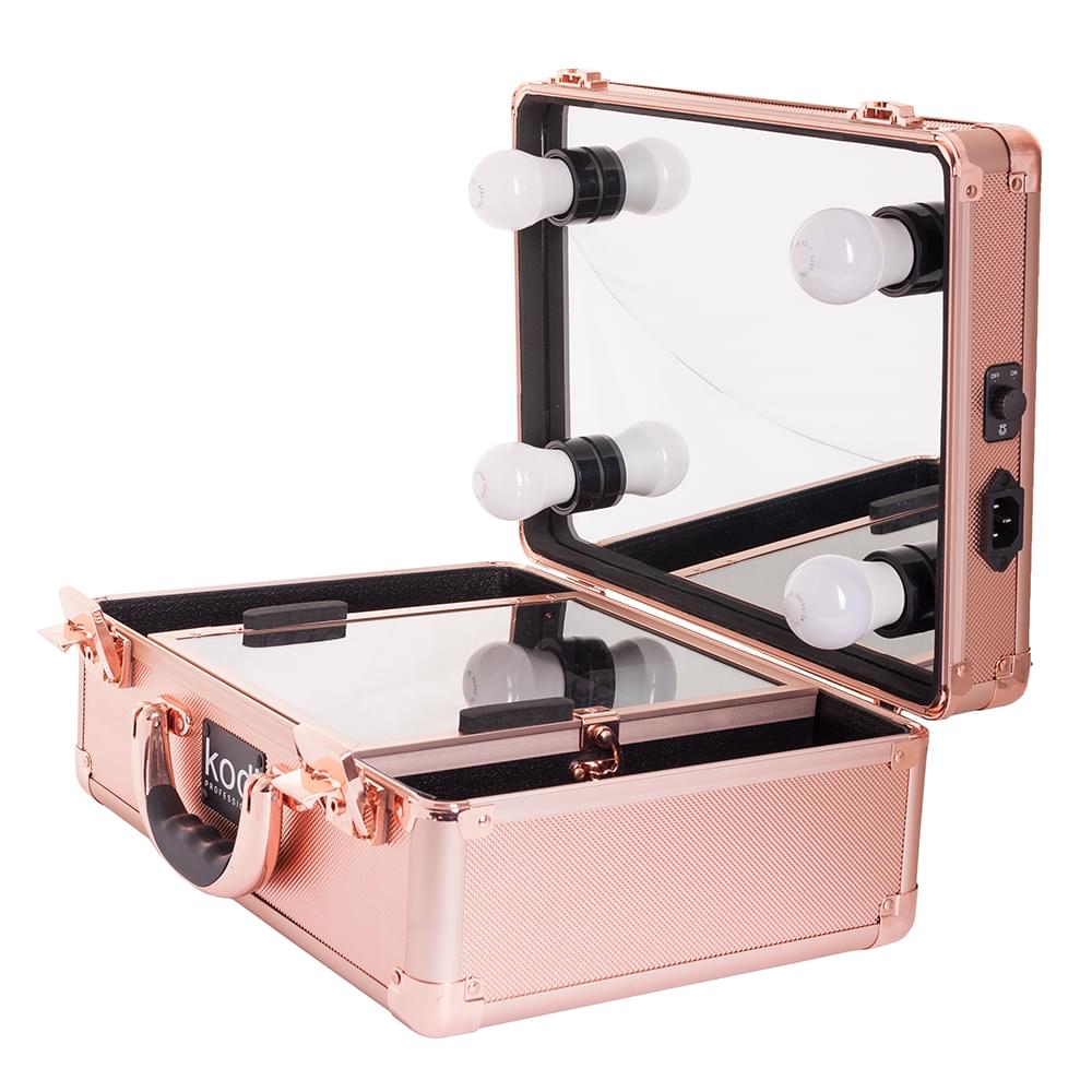 Кейс выполнен в трендовом оттенке «розовое золото», материал корпуса – прочный текстурный пластик. Эргономичная прорезиненная ручка обеспечивает удобную переноску. В раскрытом виде верхняя часть кейса содержит зеркало с системой освещения. Кейс укомплектован кабелем и 4 лампами. Нижняя часть содержит 7 ячеек разного формата. Центральный блок на 5 ячеек закрывается прозрачной крышкой для обеспечения сохранности декоративной косметики. Обивка выполнена из эко-кожи, ячейки имеют мягкие перегородки.Закрывается кейс с помощью клапанных замков-фиксаторов.