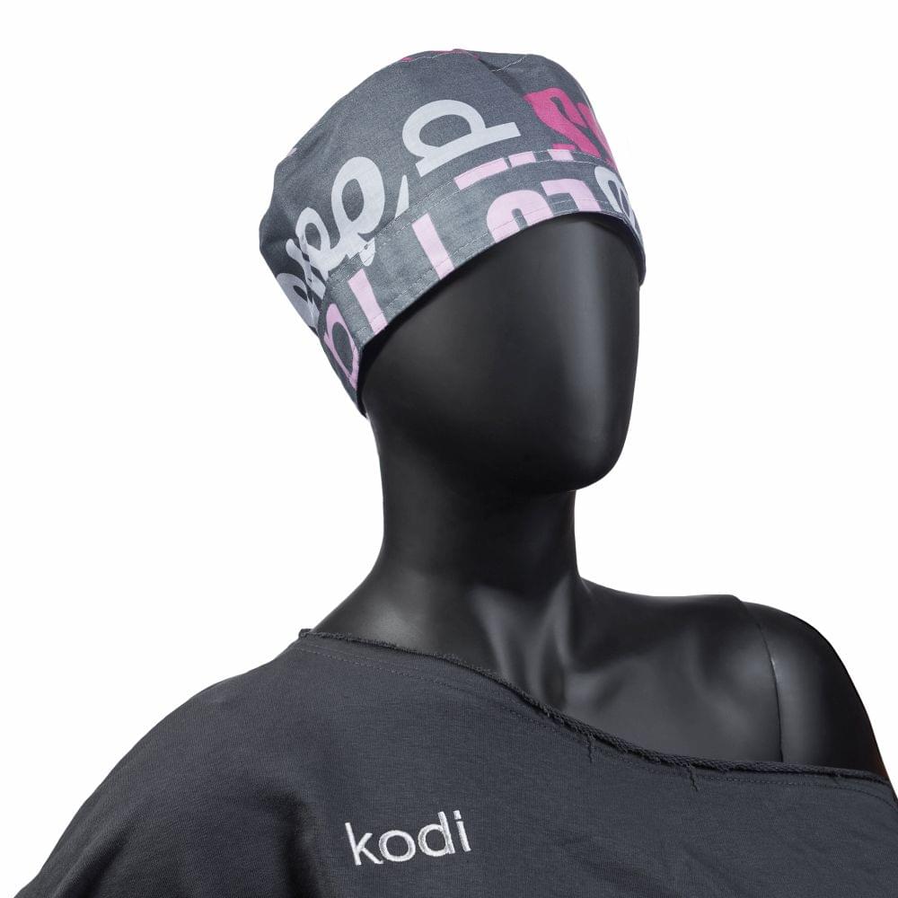 Серая шапочка для мастера, разбавленная разноцветным буквенным принтом, внесет немного непринужденности в рабочий стиль мастера. Шапочка классического кроя на резинке.