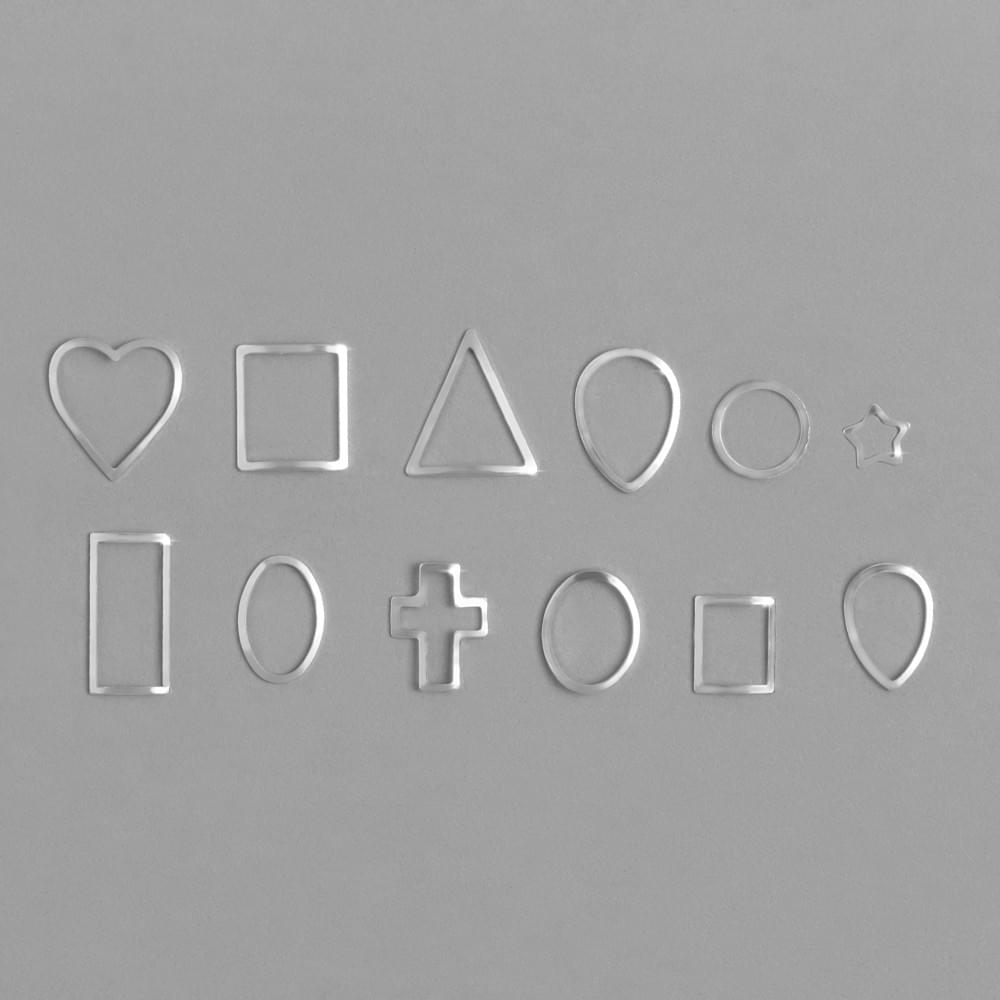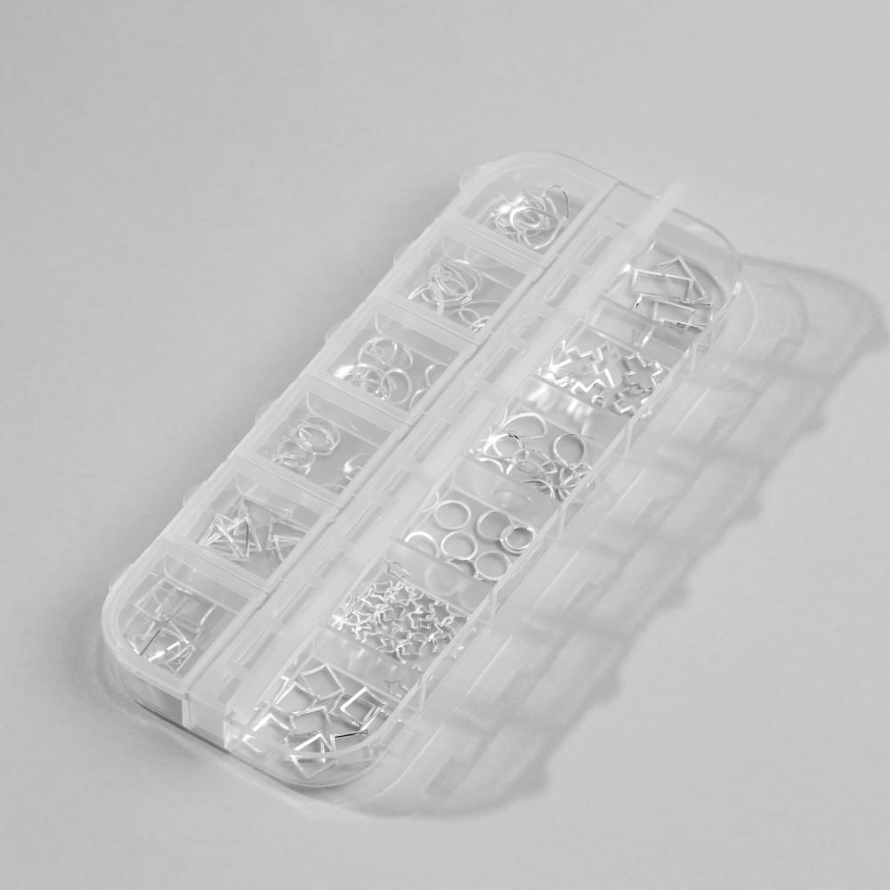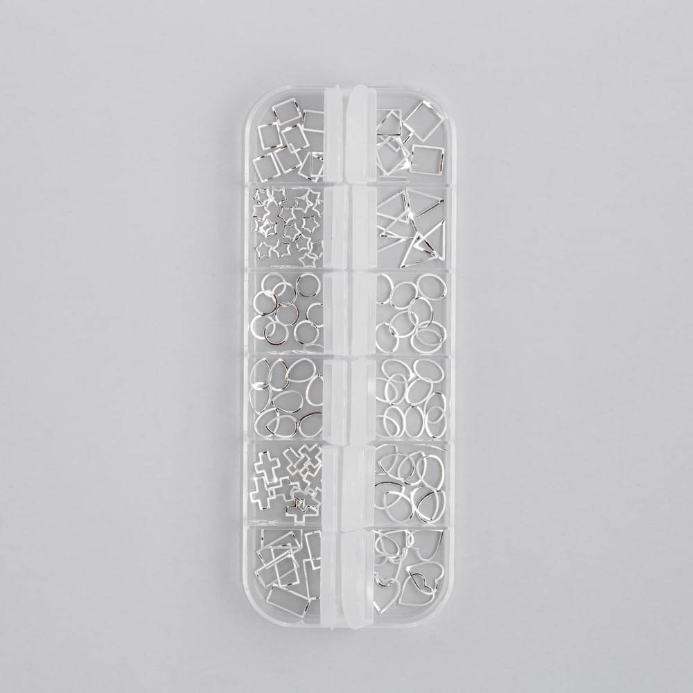 Набор №10 включает в себя прочную, прозрачную пластиковую коробку на 12 ячеек в каждой из которых — тематический металлизированный декор серебряного цвета. Все элементы представляют собой тонкие, эластичные и гибкие металлические рамки геометрических форм: овалы, круги, квадраты, прямоугольники, сердца и крестики — это далеко не полный перечень всего того, что вы найдете в наборе. Такие элементы станут отличной альтернативой литью, создавая особенную глубину и объем в композиции. С креплением подобного декора легко справится даже новичок, следующий рекомендациям от технологов.