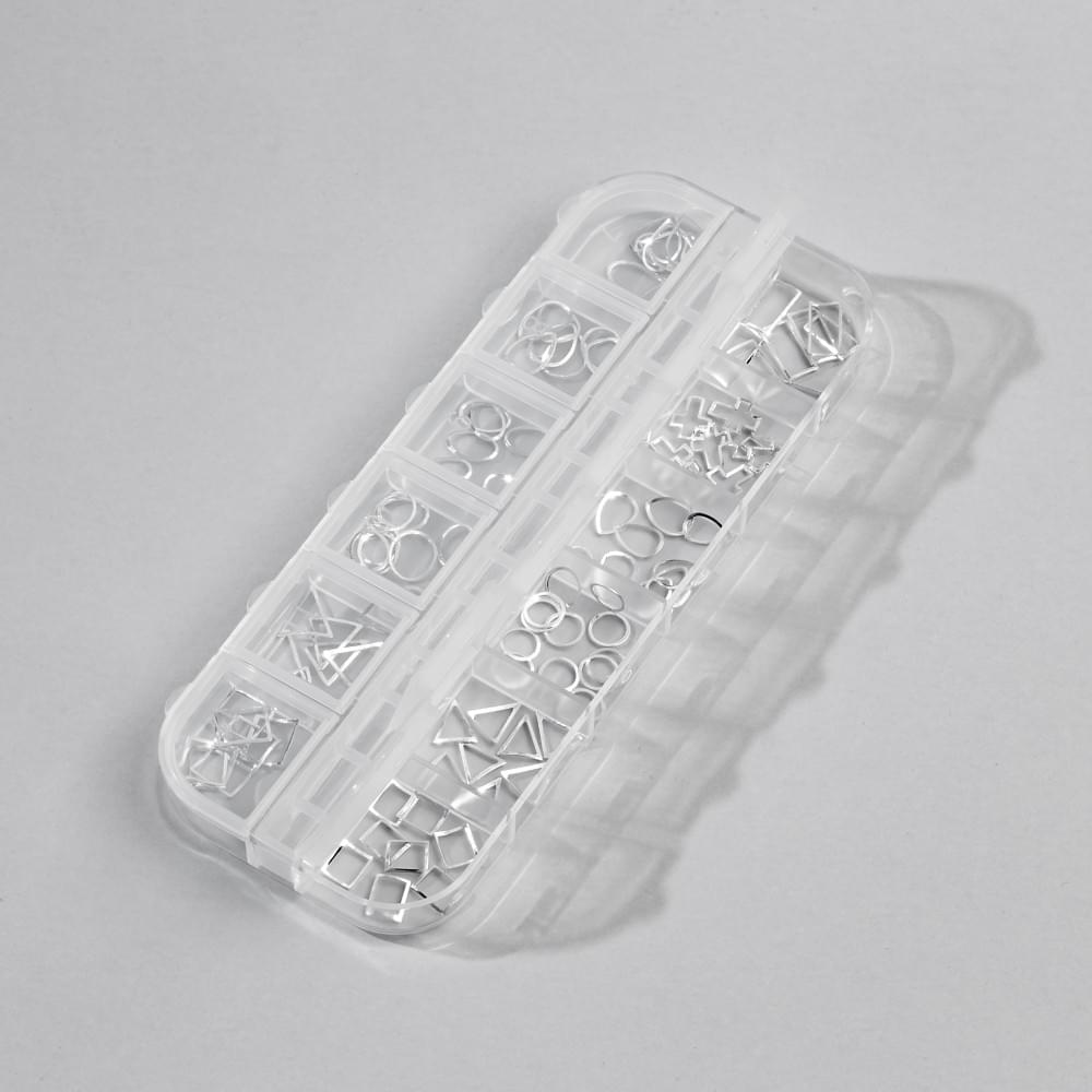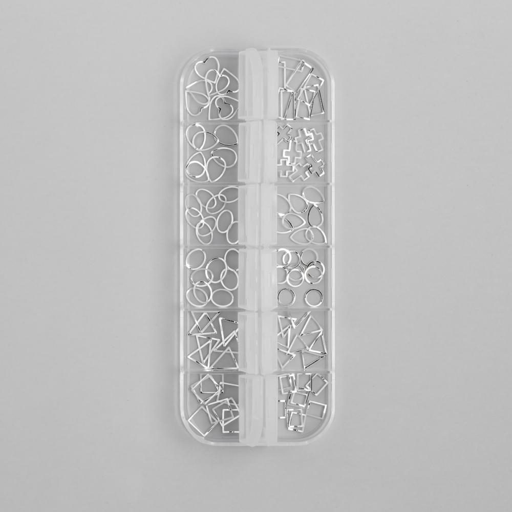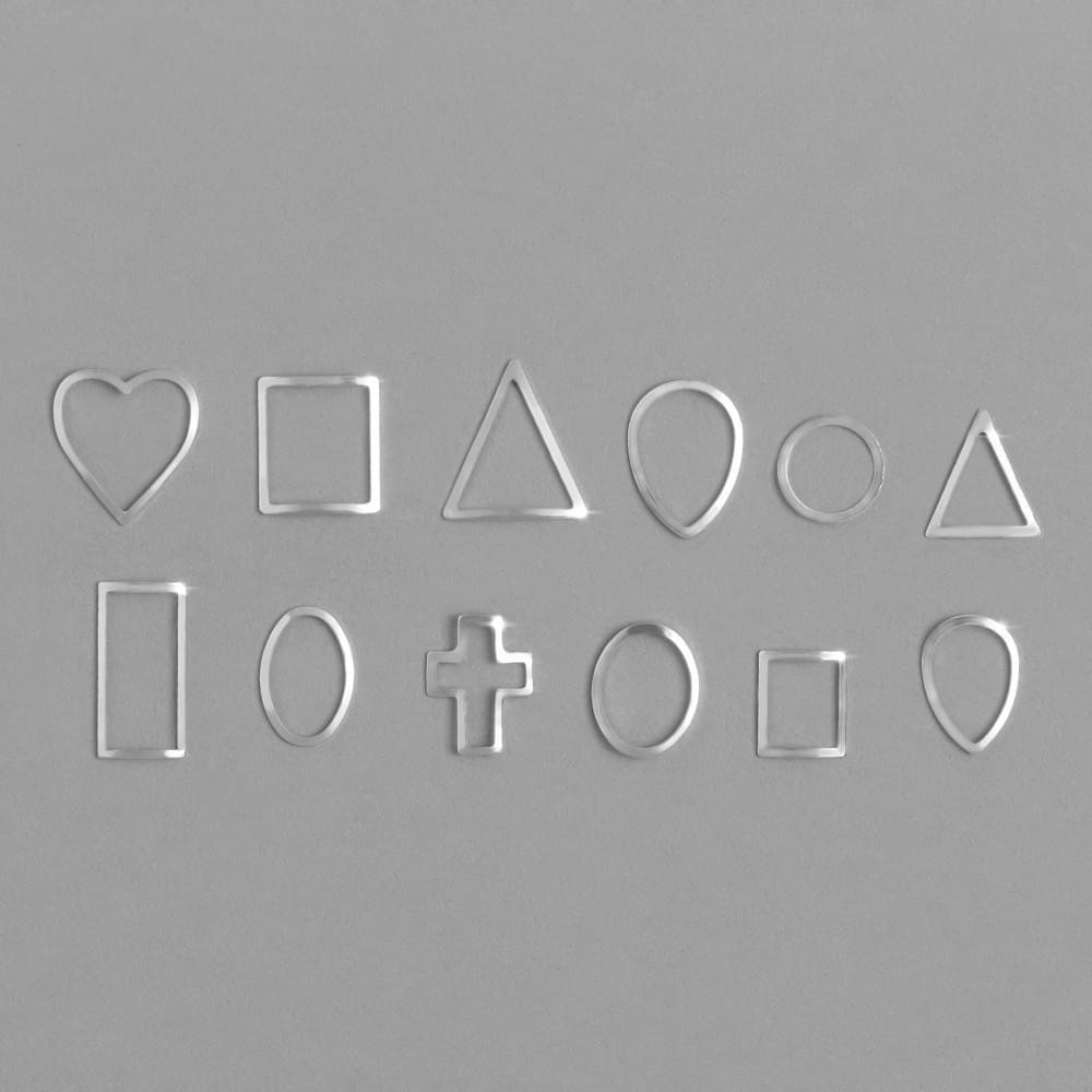 В наборе №9 замиксовано 12 тонких геометрических элементов-рамок разной формы: крестик, капля, сердце, круг, овал и квадрат — выберите то, что вам нравится и начинайте экспериментировать. Рамки фигур тонкие и гибкие, они станут отличной альтернативой литью. Просто поместите фигуру на отведенное ей место в композиции, заполните пространство внутри краской или гель-лаком, закрепите результат топом. Такой декор клиенты оценят по-достоинству, а мастера могут использовать его даже для конкурсных и выставочных работ.