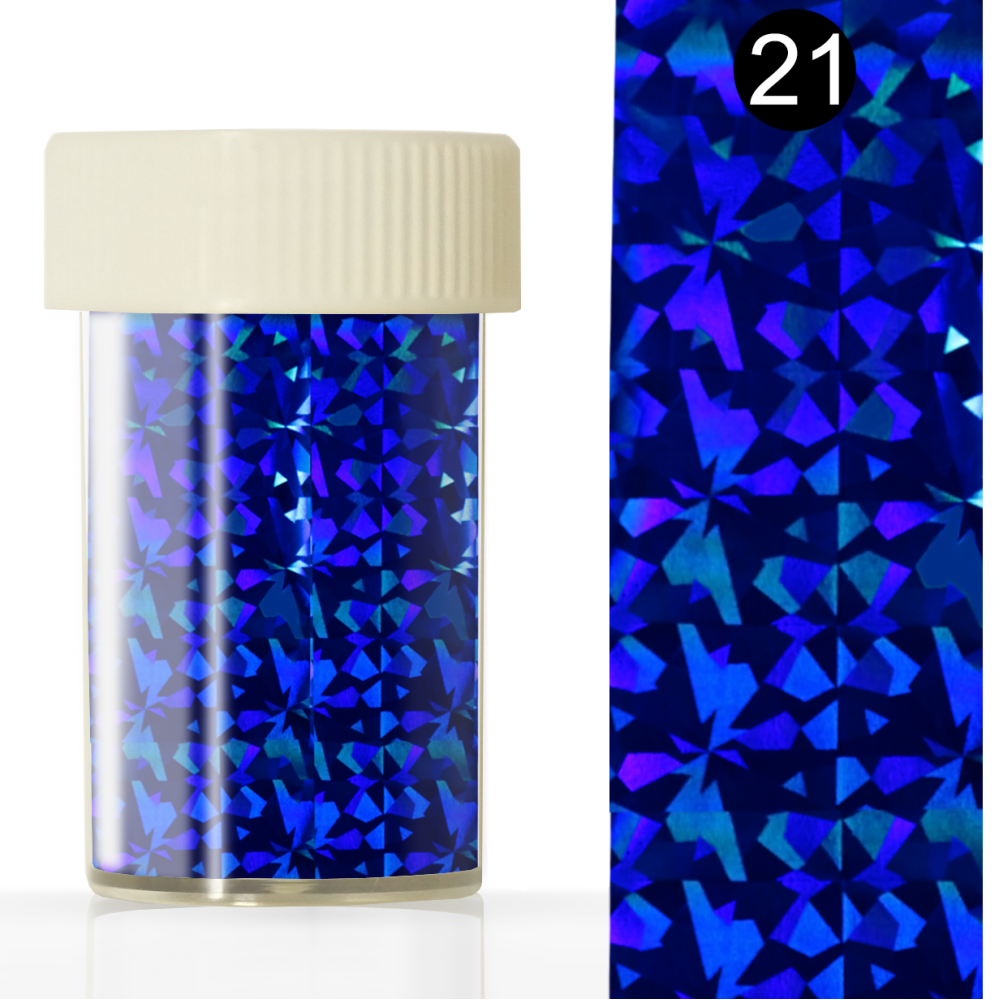 Фольга для литья в баночке KODI PROFESSIONAL № 21 имеет оригинальный калейдоскопический принт из разноформатных светоотражающих осколков. Голограммный блик придает рисунку визуальную рельефность и является интересным акцентом в комбинированных нейл-артах. Глубокий синий цвет дизайна, позволяет подобрать аналогичный оттенок гель-лака в другой текстуре: глянце, шиммере, матовом варианте.