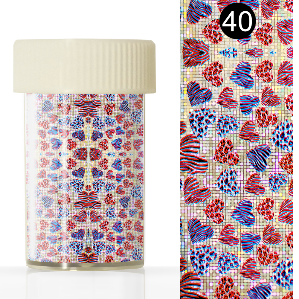 Фольга для литья в баночке KODI PROFESSIONAL № 40 – отличается милым рисунком в виде стилизованных сердечек с различной прорисовкой на металлизированном фоне, стилизованном под тканевое плетение. За счет цельности рисунка фольга предназначена для цельного нанесения на ногтевую пластину и использования в комбинированных дизайнах ногтей. Материал легко ложится на ногти и полностью пропечатывается на липком слое базового покрытия.