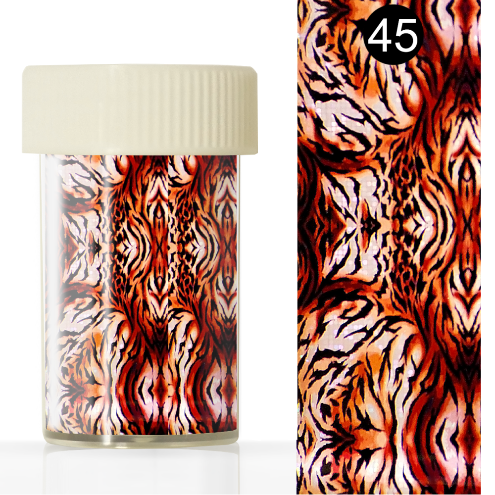 Фольга для литья в баночке KODI PROFESSIONAL № 45 – это металлизированное покрытие в виде плотного напыления из мелкодисперсных частиц, которое перепечатывается на липкий слой базового материала. Оригинальный тигровый принт в огненной гамме оранжевого и желтого цвета эффектно оттеняется металлическим переливом покрытия. Для того, чтобы комбинированный нейл-арт с тигровым оттенком получился гармоничным и цельным, лучше выбрать аналогичные цвета гель-лаков для основного покрытия ногтей.