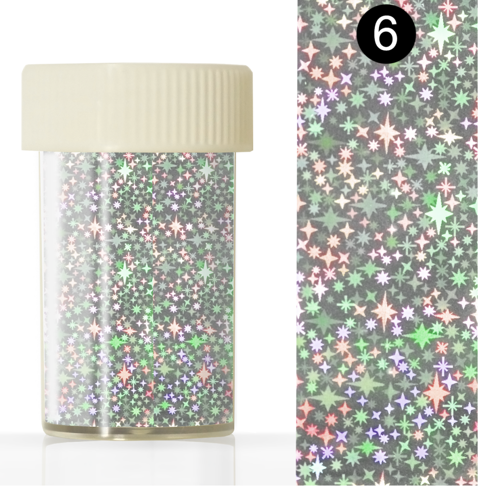 Фольга для литья в баночке KODI PROFESSIONAL № 6 представляет собой длинную ленту в формате 4*110 см, помещенную в компактную баночку для максимального удобства в работе и хранении материала. Рисунок металлизированного напыления выполнен в виде маленьких звездочек зеленого, персикового и сиреневого цвета разных размеров. Подобрав гармоничный оттенок гель-лакового покрытия для основного цвета ногтей, можно оформить несколько пальцев руки с помощью фольгированного дизайна.
