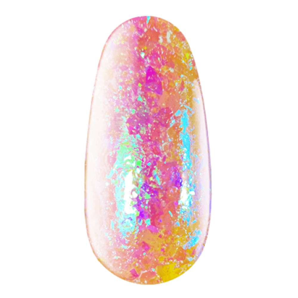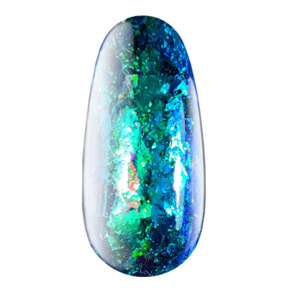 Хлопья имеют фракции разных размеров, но при этом ультратонкие, за счет чего гладко и равномерно распределяются, не торча из-под топа. В зависимости от угла наклона, выбранного цвета покрытия либо типа освещения хлопья создают интересные и неповторимые визуальные эффекты. Чтобы уменьшить яркость такого элемента, достаточно просто использовать матовый топ. Оттенок №03 — яркая голограмма зеленого, синего и желтого цвета.