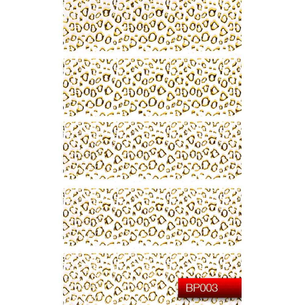 Стикеры для дизайна ногтей Nail Art Stickers BP 003 со стилизованным животным принтом в виде золотистых контуров пятен леопарда на прозрачном фоне. Линии рисунка прописаны таким образом, что в готовом дизайне выглядят как техника объемного золотого литья. Универсальный цвет декора позволяет экспериментировать с различными вариантами цветового оформления основного покрытия ногтей. Эластичная основа наклейки без усилий растягивается по поверхности ногтевой пластины, не изменяя пропорциональности рисунка.