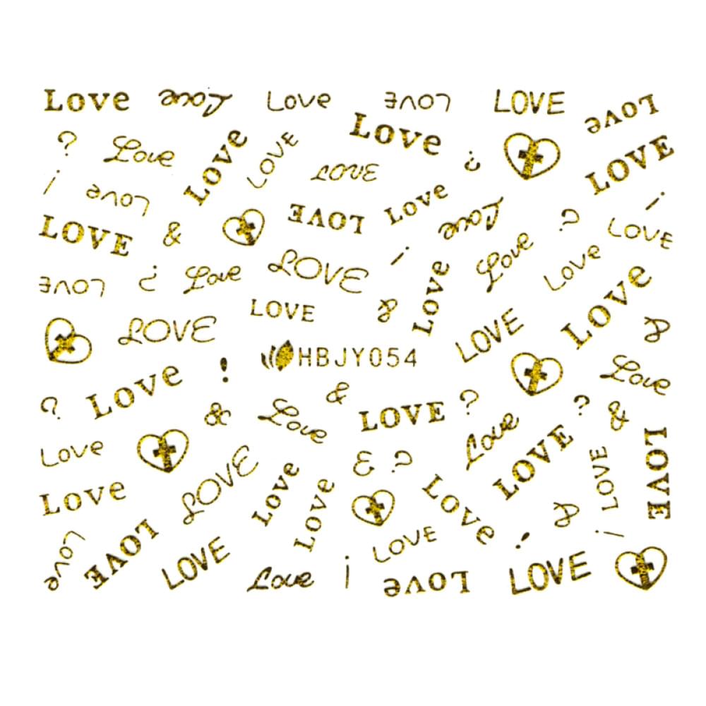 Стикеры для дизайна ногтей Nail Art Stickers № 054 – это высококачественная эластичная пленка на клеевой основе с принтом из стилизованных надписей «Love» и соответствующей романтической символики. Каждая надпись имеет универсальный размер, подходящий под различную длину ногтевой пластины и пропечатана разным шрифтом в золотом цвете. Металлизированный дизайн используется в нейл-артах в комбинации с другими элементами декора и позволяет создать самые разноплановые работы на искусственных или натуральных ногтях.