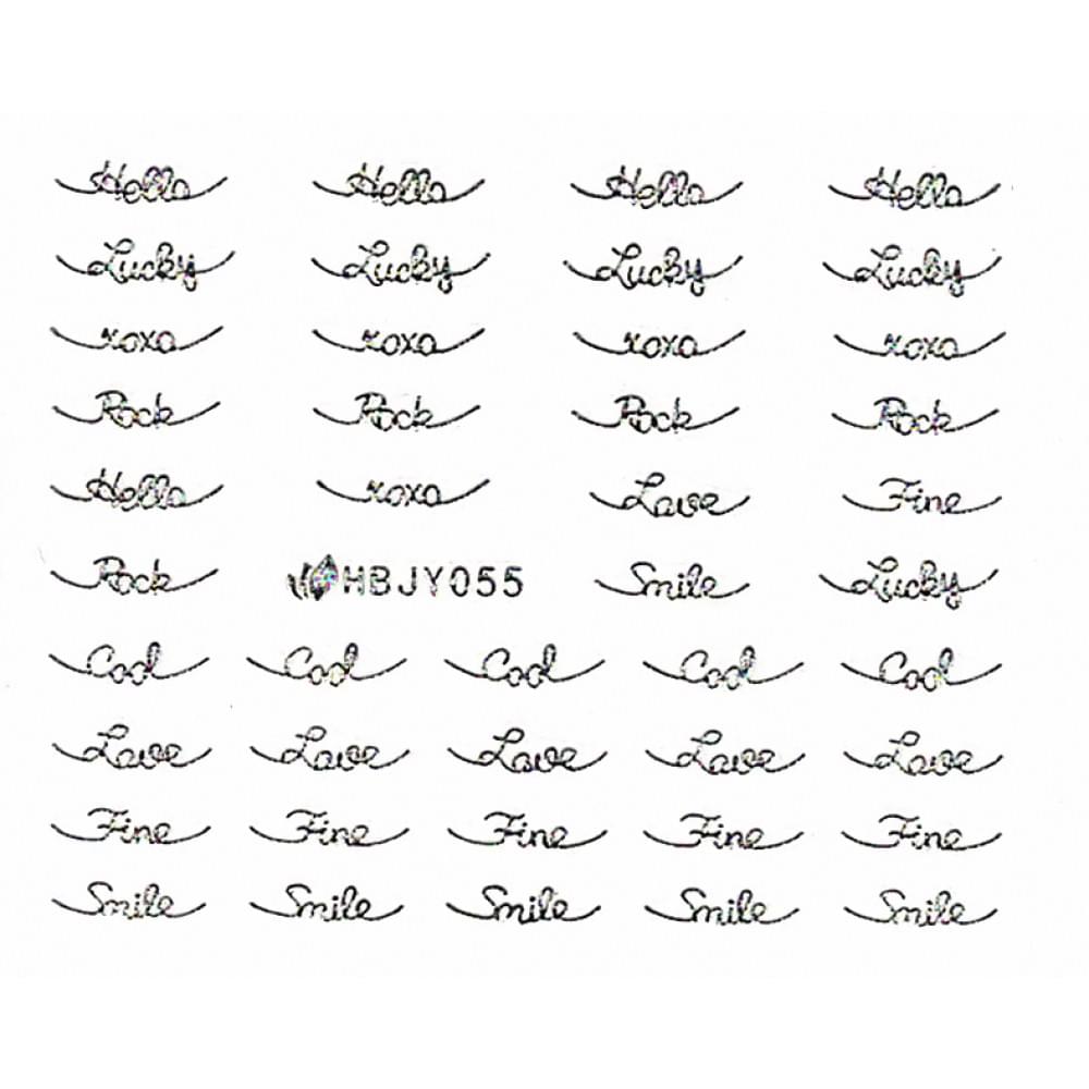 Стикеры для дизайна ногтей Nail Art Stickers № 055 – это тонкая эластичная наклейка с четко пропечатанным металлизированным принтом в виде стилизованных надписей. Каждая надпись обособлена и может использоваться для оформления ногтей любой длины. За счет отличных характеристик пластичности и прочности материала, дизайн просто наносится на нотевую пластину и имеет прочную сцепку. Минимальные затраты времени на нанесение и высокий показатель износостойкости готового дизайна делают стикеры для ногтей обязательным материала в арсенале мастера.