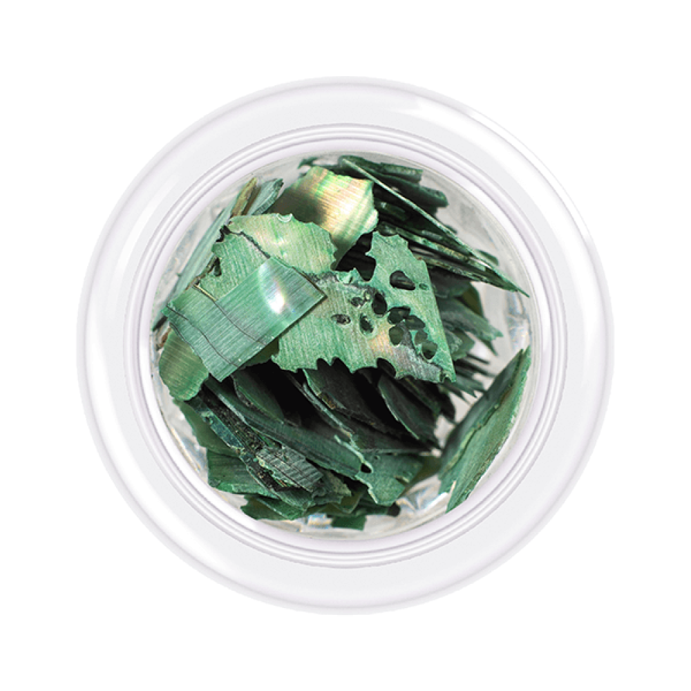 Shells style — это тонкие кусочки натурального перламутра разной формы и размера. Мы окрасили их по специальной технологии, чтобы получить необычные цветовые решения для маникюра. Ракушки можно ломать и выкладывать ими любые узоры, можно применять их в тематическом аквариумном дизайне. Отдельного внимания заслуживает палитра цветов серии. Оттенок №08 — классический перламутровый зеленый.