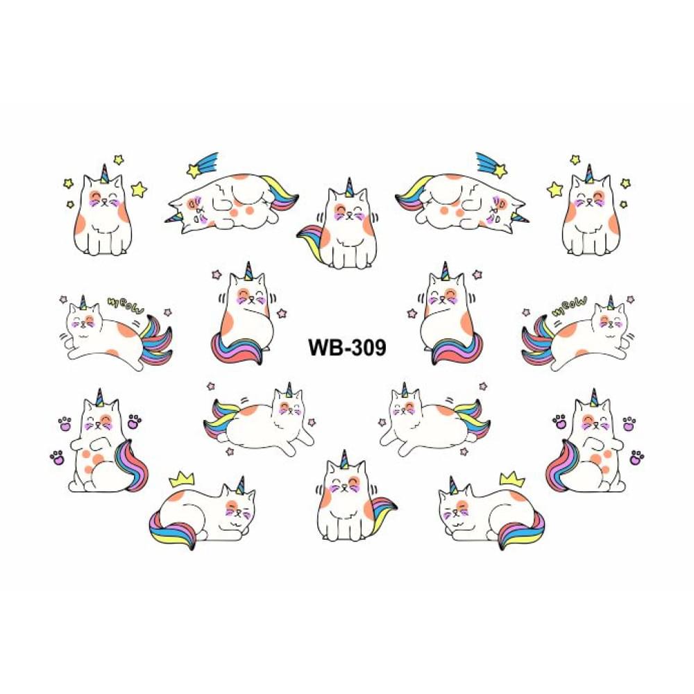 Современные дизайны с использованием слайдеров существенно сокращают временные затраты на маникюр. В ассортименте бренда Kodi Professional представлено сотни вариантов на любой вкус. Слайдер-дизайн WВ-309 — это милые изображения котов-единорогов на белой подложке. Такие стикеры придадут дизайну ноты инфантильной романтичности.