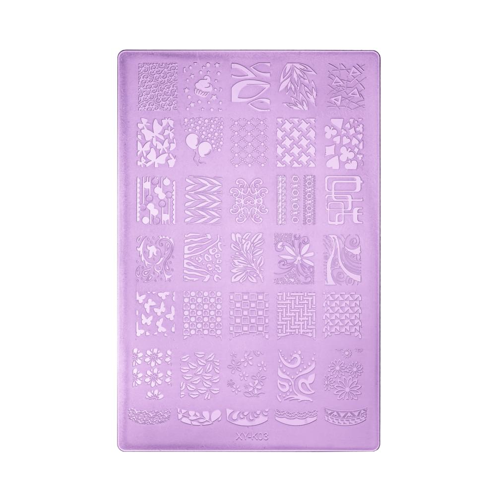 В ассортименте KODI PROFESSIONAL представлено большое количество пластин с орнаментными узорами на любой вкус. Пластина для стемпинга К03 имеет размер 9,5 х 14,5см и выполнена из прочного пластика фиолетового цвета. Данная пластина имеет высокоточную резьбу и содержит 35 оригинальных узоров произвольной тематики.