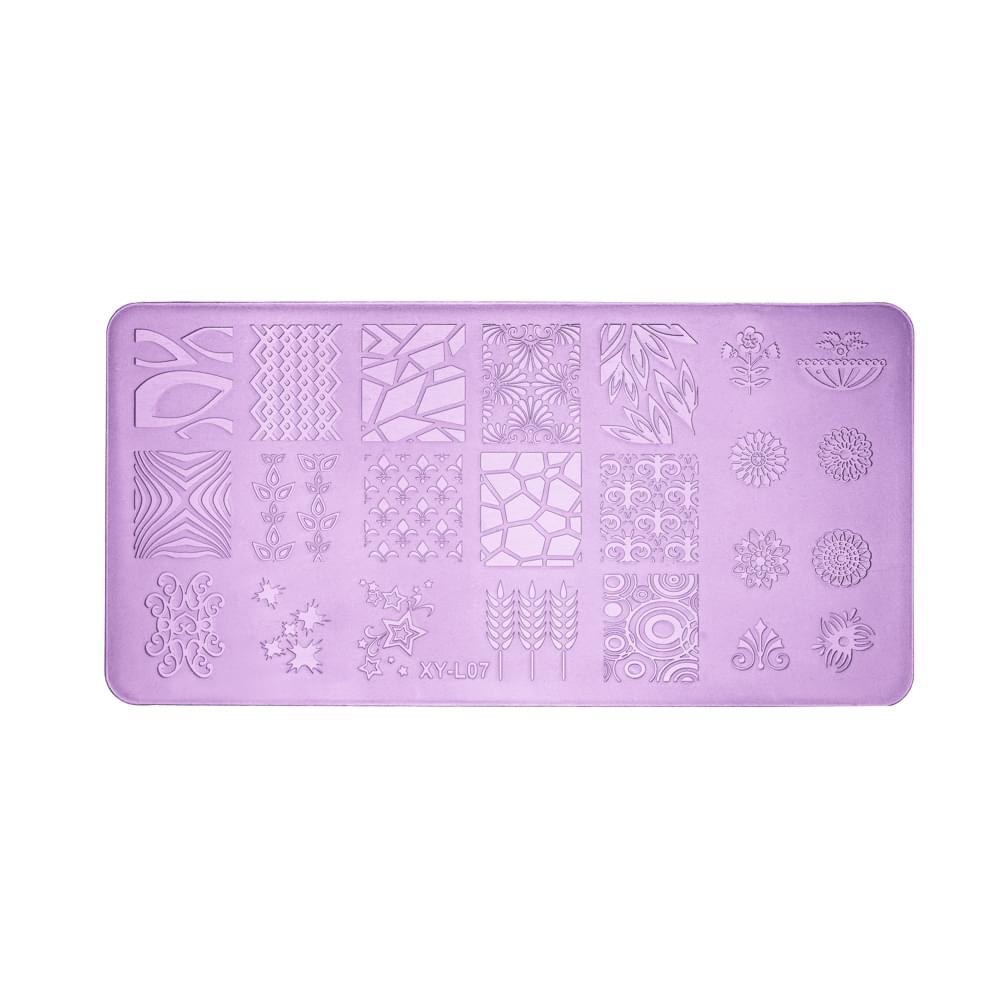 Пластина для стемпинга L07 имеет размер 6 х 12см и выполнена из прочного пластика фиолетового цвета. Данная пластина имеет превосходное качество гравировки и содержит более 20 узоров и рисунков на природную тематику.