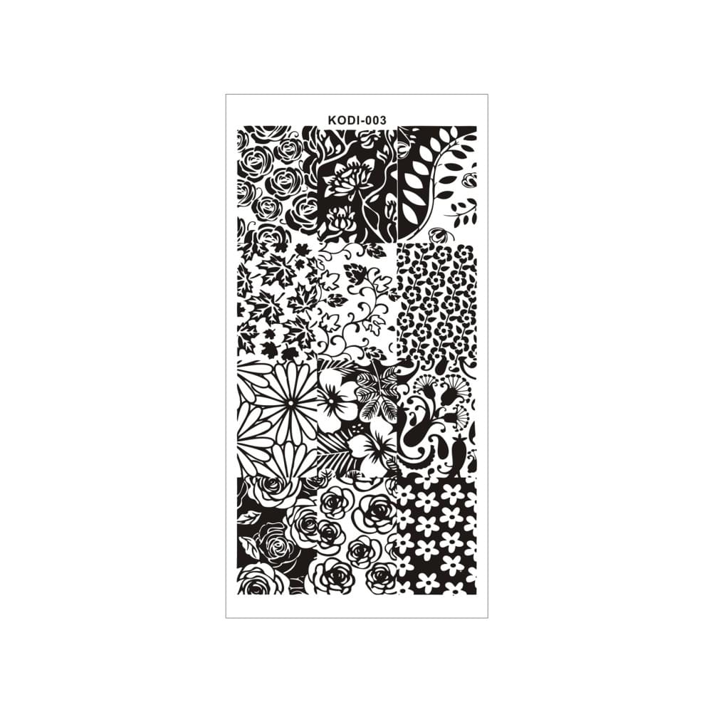Пластина Kodi-003 выполнена из тонкого металлического листа и содержит множество узоров цветочно-лиственной тематики для создания нежных креативных дизайнов.