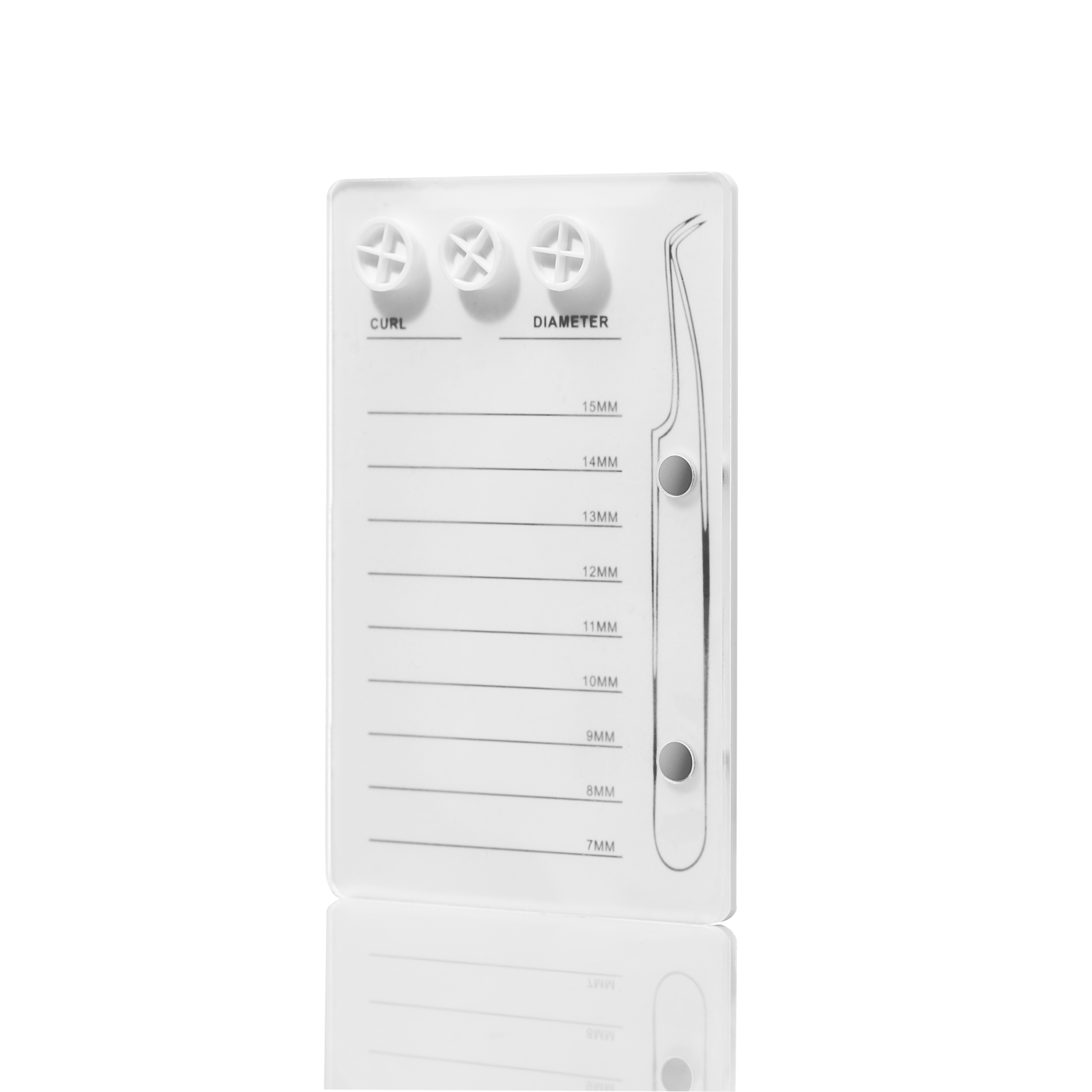 Палітра має 9 рядів для розміщення вій найбільш затребуваних довжин — від 7 до 15 мм, що дозволяє швидко орієнтуватися у матеріалі та працювати без зайвих рухів. Ідеально гладенька поверхня контрастного білого кольору забезпечує комфортне викладання вій та точний підбір потрібної довжини.