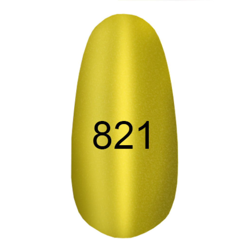 Гель-лак №821 представлений в насиченому золотисто жовтому кольорі з салатовим відтінком. Відблиск відповідає основному кольору покриття і має шиммерну текстуру, яка забезпечує дизайн мерехтливим відблиском дорогого металізованого напилення.