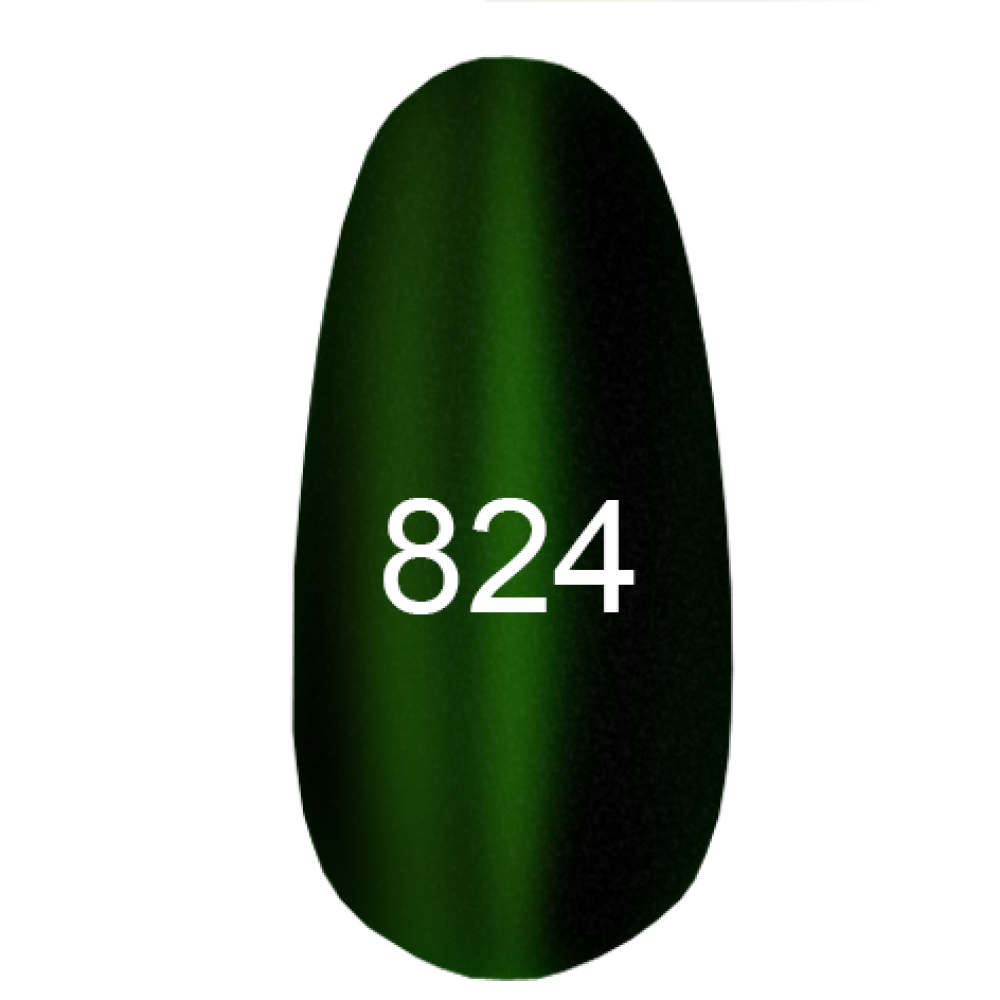 Гель-лак №824 має солідний темно зелений колір з перламутровим відблиском в тон. Матеріал виглядає ефектно і в якості самостійного покриття нігтів в більш лаконічних дизайнах, і як фонова підкладка для всіляких візуальних ефектів і нанесення декоративних елементів - стразів, підібраних за кольором, об’ємного розпису вручну чи малюнків виконаних в витонченій техніці лиття.