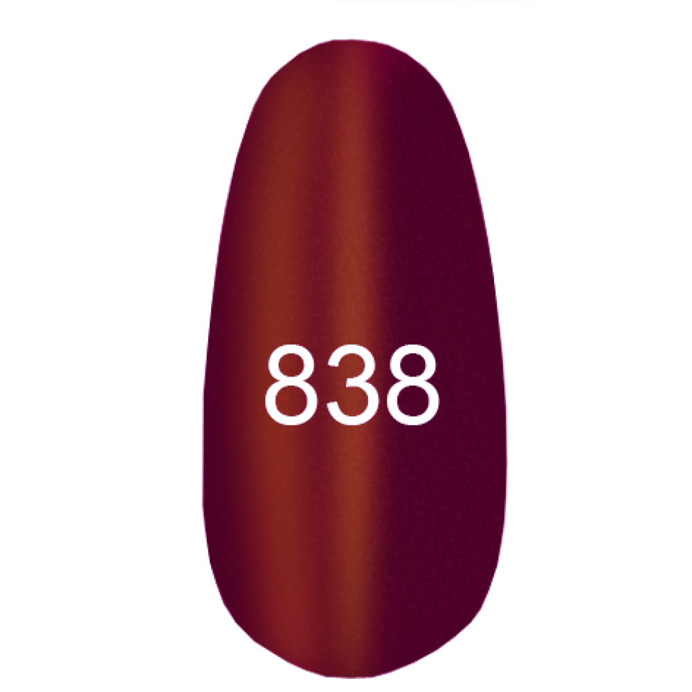 Гель-лак № 838 представлений в розкішному відтінку міді з перламутровим переливом світла. Залежно від творчого задуму майстра відблиск може бути різної контрастності та форми - для цього необхідно поекспериментувати з положенням магніту під час нанесення матеріалу. Консистенція гель-лаку дає змогу нанести рівномірне і щільне покриття, стійке до відколів і відшарувань під час носіння.