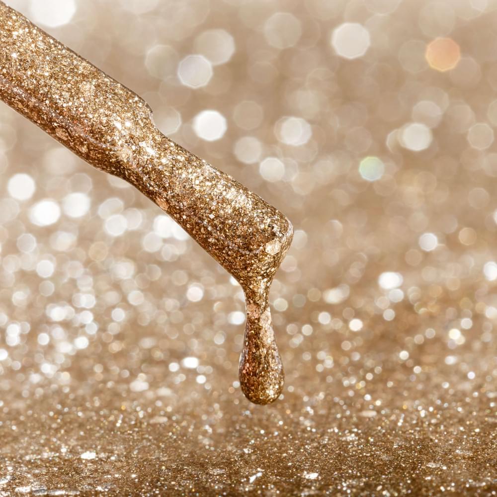 Гель-лак № 100 SH (серія SHINE) має прозору основу з брокатом і шимером в кольоровій гамі шампань. Може застосовуватися в якості додаткового покриття до основного кольору.