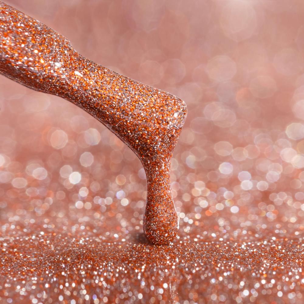 Гель-лак № 02DS: прозора основа з мідними і рудими мерехтливими частинками.