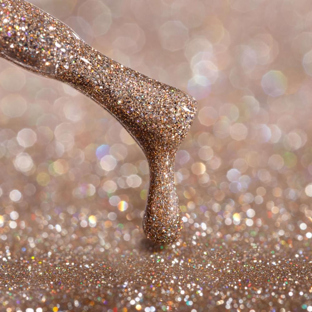 Гель-лак № 03DS: прозора основа з золотистими мерехтливими частинками.