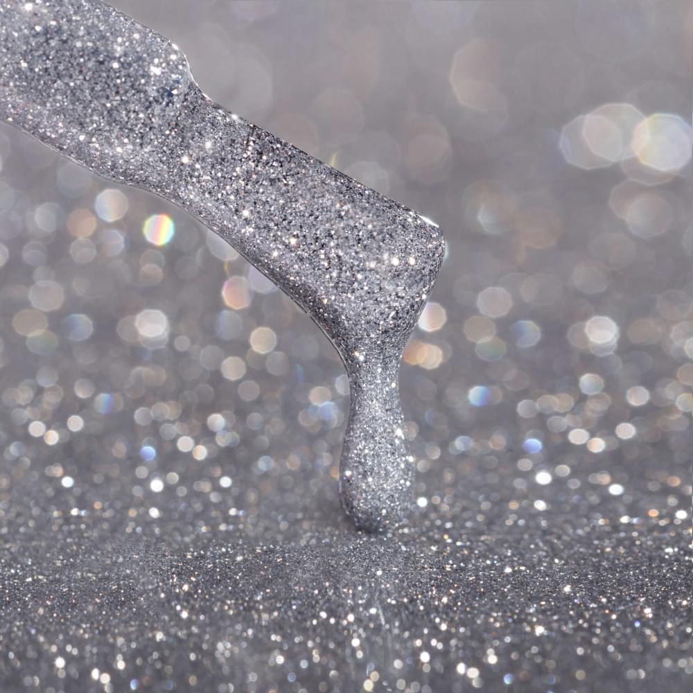 Гель-лак № 10DS: прозора основа з сріблястими мерехтливими частинками.