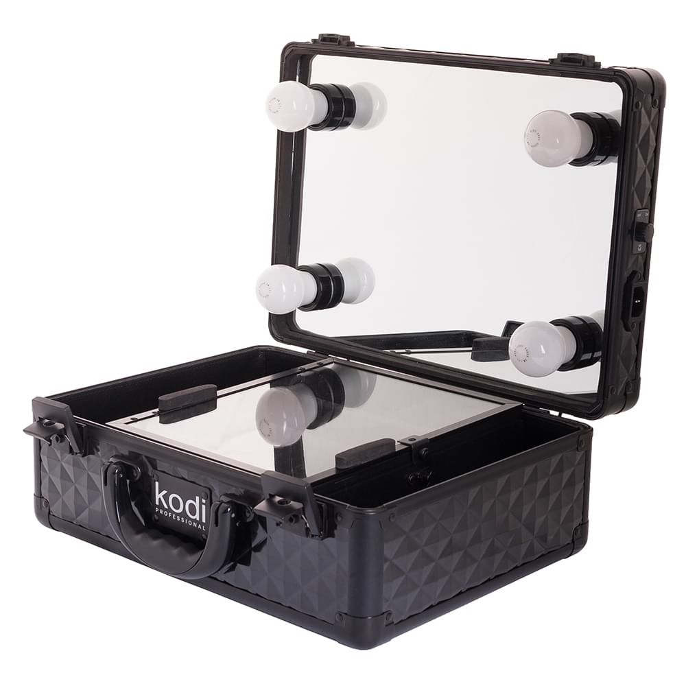 У розкритому вигляді верхня частина кейса трансформується в дзеркало з вбудованою системою підсвічування. Кабель і 4 лампи поставляються в комплекті. Нижню частину складають 7 відсіків, де можна компактно розмістити все необхідне. Центральна секція на 5 відсіків закривається прозорою кришкою для візуальної оцінки вмісту. Корпус кейса виконаний з міцного високоякісного пластику, щоб вміст залишився цілим і неушкодженим навіть при механічному впливі. Для зручного перенесення кейс оснащений ергономічною ручкою. Закривається кейс з допомогою клапанних замків-фіксаторів.