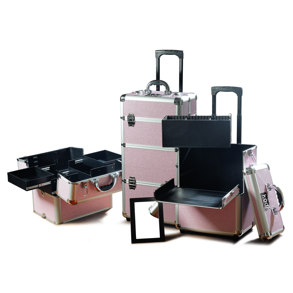 Каркас кейса изготовлен из высокопробного пластика для высокой прочности при профессиональной эксплуатации. Внешнее оформление - перфорированный пластик розового цвета, декорированный блестками.