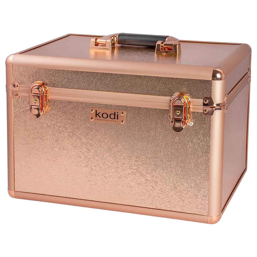 Зовнішня обробка корпусу виконана з міцного текстурного ПВХ у відтінку рожеве золото. Додатково міцність посилена за рахунок декоративних алюмінієвих елементів відповідного відтінку. Зручна ручка з накладкою забезпечує комфорт при переміщенні кейса. Закривається кейс за допомогою клапанних замків на передній стінці аксесуара. Усередині кейс укомплектований компактним дзеркалом.