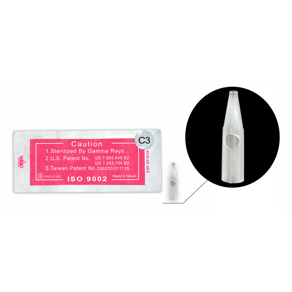 Ковпачок одноразового застосування – дюза, що виготовляється в різних конфігураціях, застосовується для рівномірно розподілу барвника, а також спрямовує і концентрує рух голки. Ковпачок обробляється гамма-променями, стерильний і упакований в індивідуальну упаковку. Ковпачок С3 підходить для голки 7R.