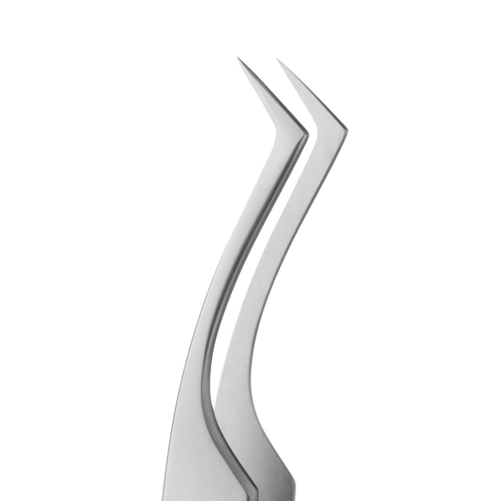 Унікальна вигнута форма пінцету робить процес формування пучків швидшим та простішим. Завдяки щільному і рівномірному змиканню робочих країв, пінцет легко підхопить навіть найтонші вії, не деформуючи їх і не створюючи на них заломи. Інструмент виготовлений із якісного сталевого сплаву, стійкого до корозії. Такий матеріал гарантує довговічність пінцету, дозволяє піддавати його гарячій та холодній стерилізації. Укомплектований захисним футляром.