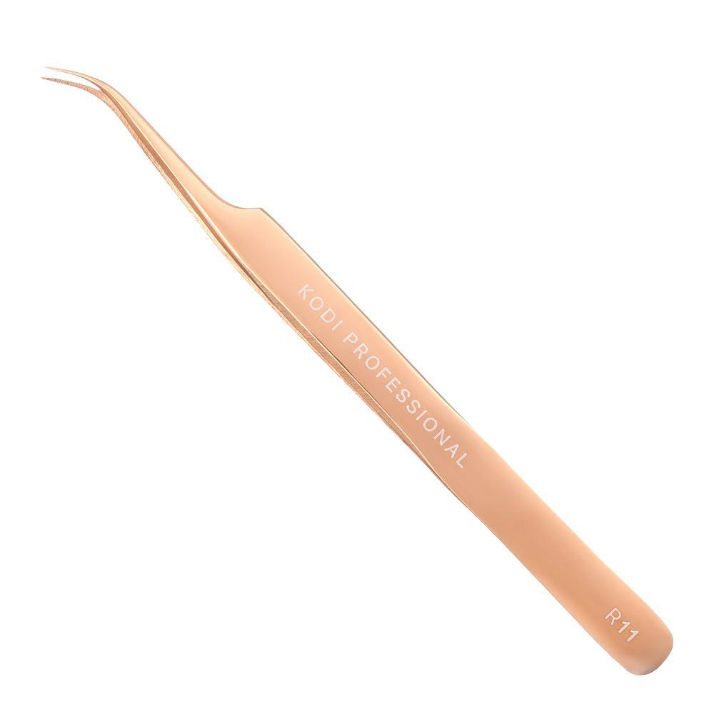 Модель вигнутого пінцету R11 призначена для кріплення навіть найбільш тонких вій на внутрішньому та зовнішньому куточках повік. Він настільки делікатний та зручний, що може стати альтернативою класичного прямого точкового пінцету. Також інструмент можна використовувати у об'ємних техніках моделювання. Його робочі краї надзвичайно легко і щільно стуляються, дозволяючи фіксувати найтонший матеріал. Професійне заточування та ідеальне високоякісне полірування запобігає деформації та заламуванню волосків. Матеріал виготовлення — стійка до корозії сталь, що робить можливим багаторазову стерилізацію.