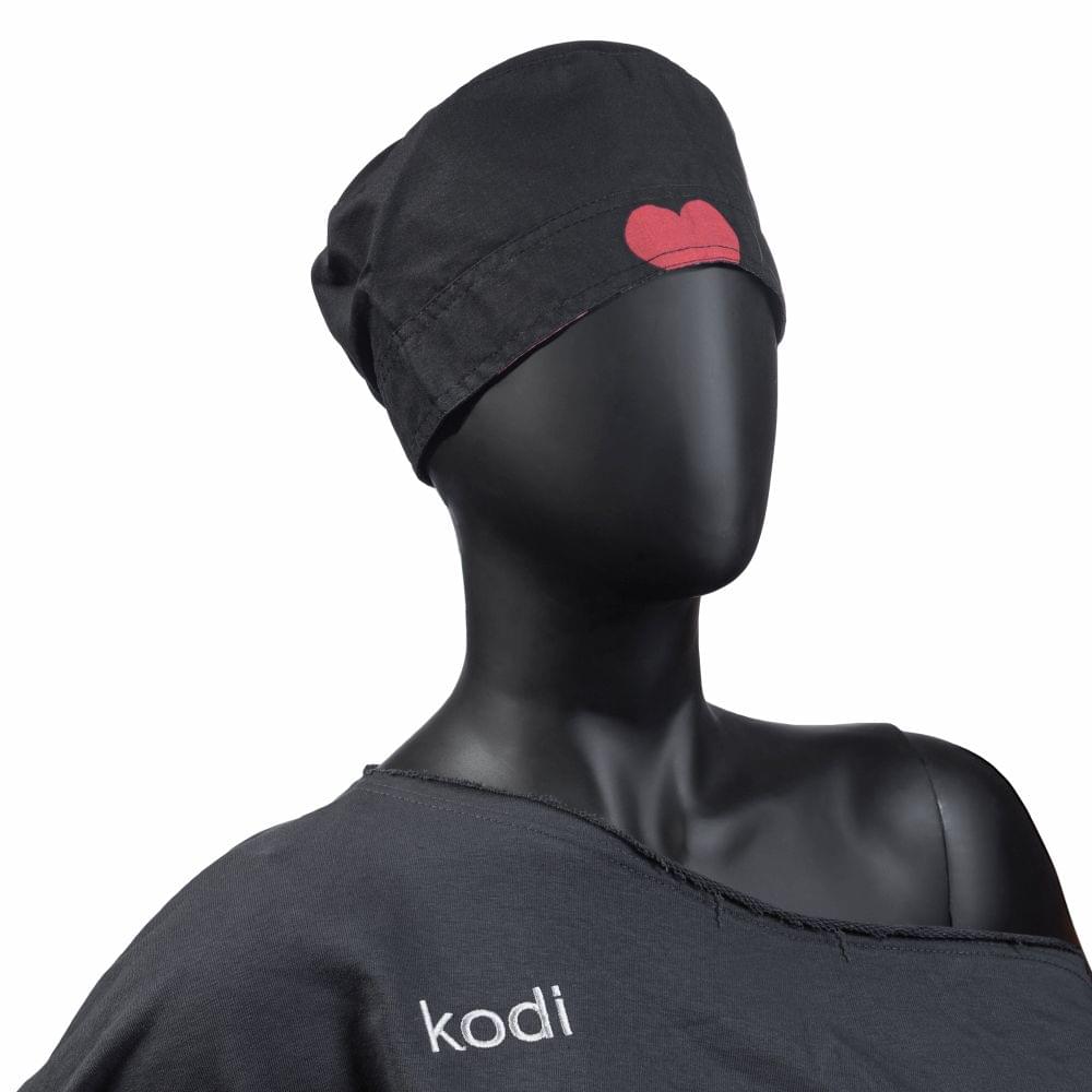 Шапочка чорного кольору з сердечком по центру – одна з найяскравіших і при цьому лаконічних моделей головного убору для майстра. Ця модель завжди притягує увагу і дозволяє створити стильний робочий образ.
