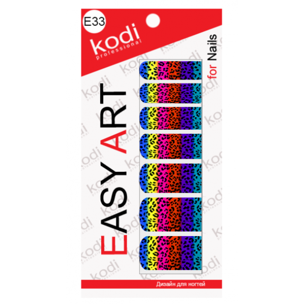 Слайдери з фотодизайну Easy Art E33 відрізняються мінімальною товщиною декоративного шару і міцним зчіплюванням клейкої поверхні з полімерним покриттям. В упаковці 14 слайдерів за розміром нігтьових пластин, з яких можна вирізати фрагмент необхідної форми для нанесення на нігті. Тваринний принт контрастного чорного кольору на райдужному градієнті - нестандартне рішення для оригінального нейл-арту в сучасному стилі.