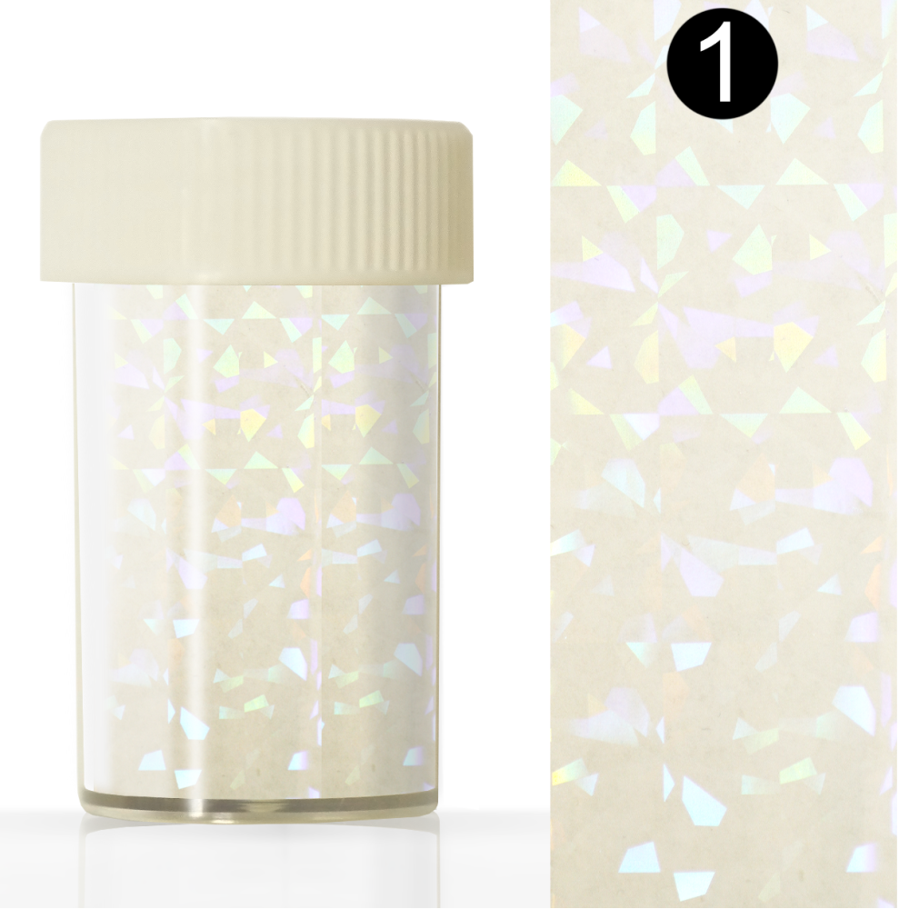 Фольга для лиття KODI PROFESSIONAL № 1 – це прозора стрічка з металізованим напиленням, яка компактно складена в баночку для зручності зберігання. Білий фон з ефектом битого скла ефектно і стильно виглядає в лаконічних дизайнах. Розмір стрічки – 4х110 см, тому матеріал можна використовувати в роботі як на всі нігті, так і в різних акцентних дизайнах.