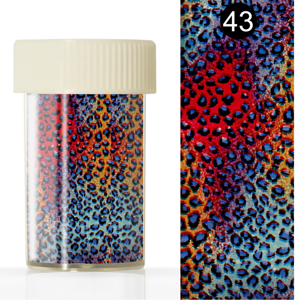 Фольга для лиття в баночці KODI PROFESSIONAL № 43 призначена для повного покриття всього нігтя, щоб зберегти цілісність та закінченість створеного малюнку. Благородні відтінки стриманого синього та червоного кольору підкреслюють вишуканість дрібного леопардового принту. Ефектна кольорова розтяжка фонового градієнта забезпечує цілісність нанесеного дизайну та гармонійно поєднується з основним кольором гель-лаку на інших нігтях. Робота з фольгою не займає багато часу під час нанесення та допомагає створити стильний та розкішний нейл-арт без складнощів в роботі.
