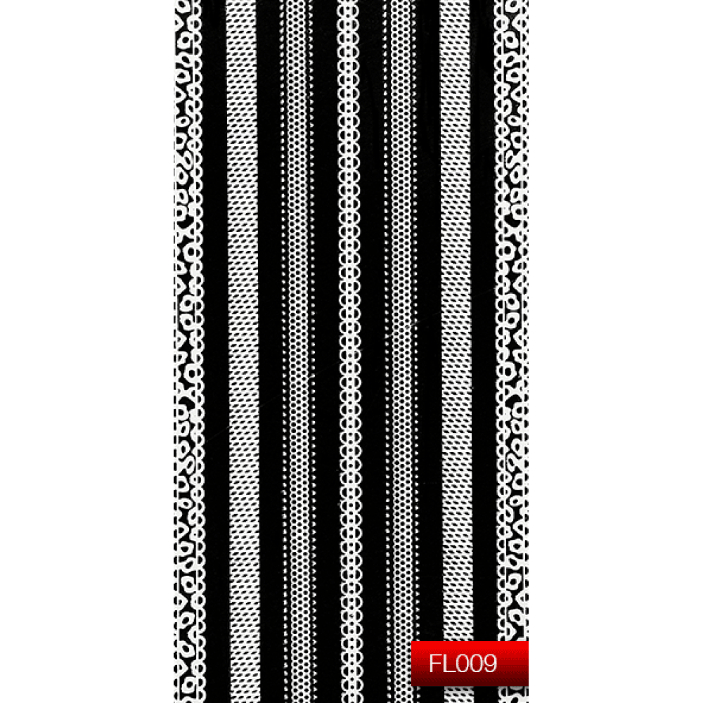 Стікери для дизайну нігтів Nail Art Stickers FL 009 виконані у вигляді семи смуг з текстурою сітки різного формату. Білі мереживні лінії сплітаються в цілісний декор на прозорому фоні стікеру та ефектно виглядають на гель-лаковій підкладці констрасних відтінків. Дизайн призначений для створення акцентного нейл-арту за рахунок чітких ліній малюнку. Різноманіття декоративних смуг дає можливість експериментувати з гель-лаками з різних кольорових гам в якості фону.