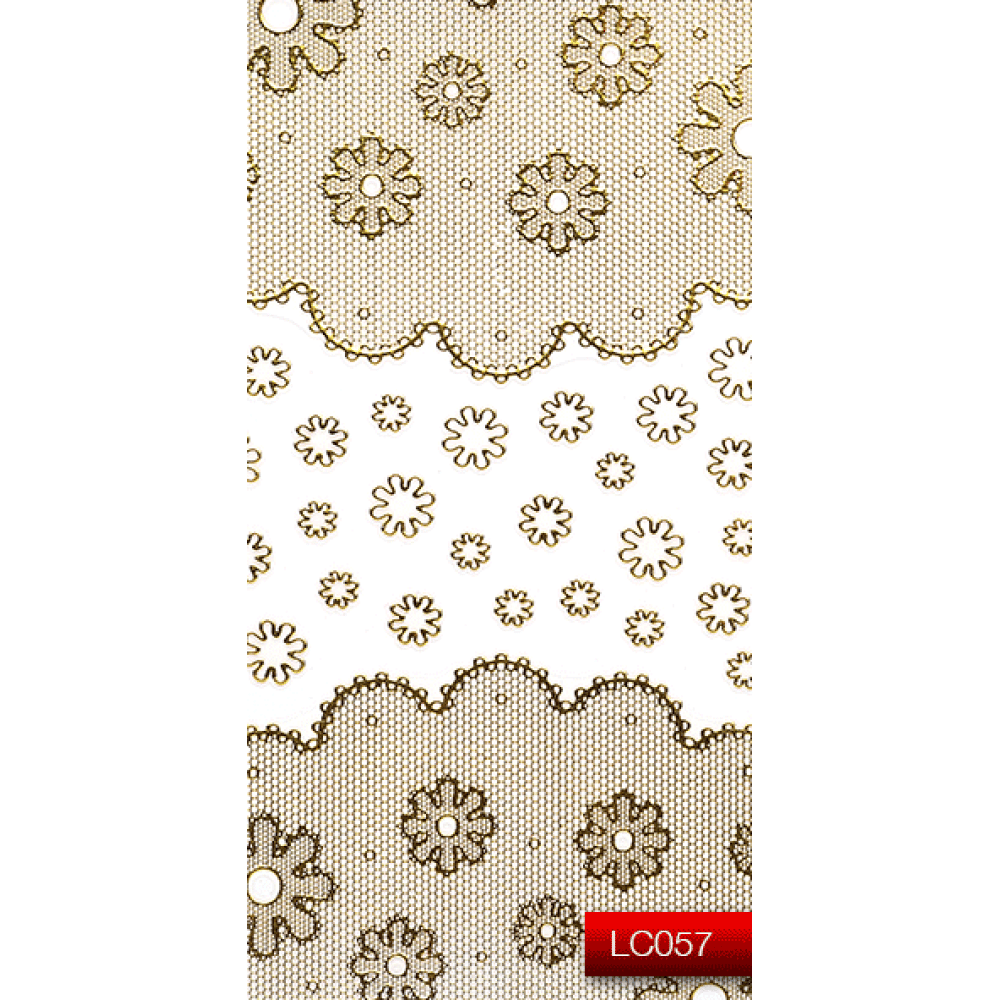 Арт-стікери LC 057 KODI PROFESSIONAL на клейкій основі представляють собою мереживний філігранний візерунок у формі краю мережива та ніжних схематичних квітів. Золоті лінії на прозорому фоні переплітаються в тонке плетіння малюнку та органічно виглядають як на однотонному гель-лаковому покриття, так і на френч-дизайнах. Наліпки виготовляються з тонкого прозорого матеріалу, який після нанесення на базовий відтінок не змінює колір підкладки. Абстрактність візерунку та наявність дрібних елементів малюнку, арт-стікер можна наносити як суцільним шаром на нігтьову пластину, так і фрагментарно, залишаючи частину дизайну незаповненою. Такий прийом створює ефект лаконічності та стриманості малюнку.
