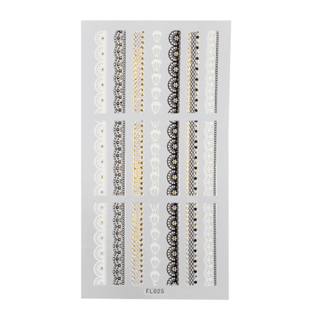 Дизайнерські наліпки Nail Art Sticker FL 025 KODI PROFESSIONAL у вигляді ажурного мережива на прозорому фоні закріплюються з урахуванням запланованого в результаті дизайну. Чим темніше фон, тим констрастіше буде виглядати біле мереживо візерунку.
