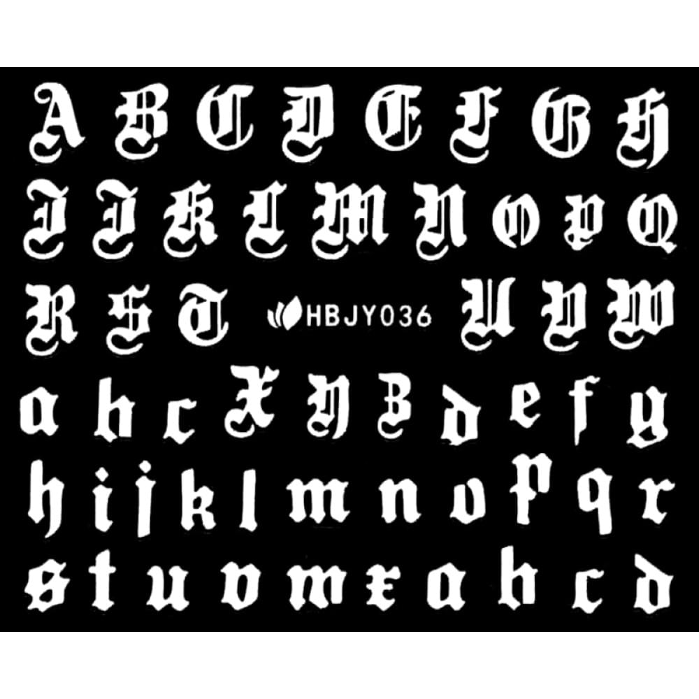 Стікери для дизайну нігтів Nail Art Stickers № 036 – це оригінальний набір відокремлених одна від одної літер алфавіту, стилізованих під готичну тематику. Дизайн виконаний у вигляді білих зображень літер на прозорому тлі, тому в якості підкладки краще вибрати класичний чорний гель-лак або інші контрастні відтінки. Стікери виконані з еластичного і міцного матеріалу, за рахунок чого забезпечується висока зносостійкість покриття і легкість роботи з дизайном.