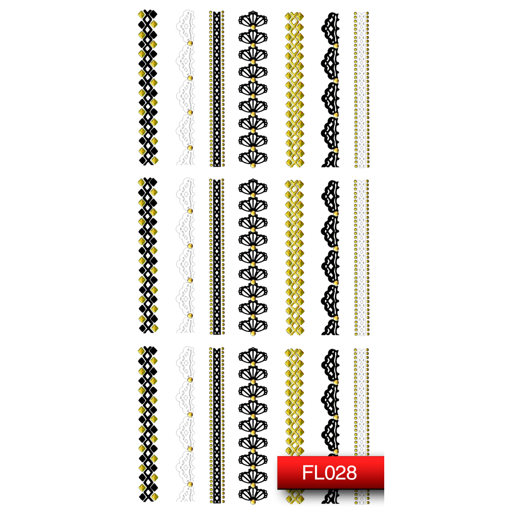 Стікери для дизайну нігтів Nail Art Stickers FL028 - це наклейка з прозорим фоном, на який нанесено декілька смуг з ажурними орнаментами в різному стильовому напрямку. У кожному орнаменті комбінуються елементи різних кольорів: золотого, чорного і білого. Таке оформлення разом з ажурною текстурою додає пікантність на перший погляд непомітним акцентом і ефектно виглядає на гель-лаковому покритті будь-якого відтінку. За рахунок різноманітності форм і комбінацій кольору, наклейку можна використовувати в різних дизайнах нігтів не один раз, тому що при фрагментному нанесенні матеріал витрачається мінімально. Еластичність і міцність клейкого шару забезпечують довгострокову експлуатацію дизайну зі збереженням початкового зовнішнього вигляду.