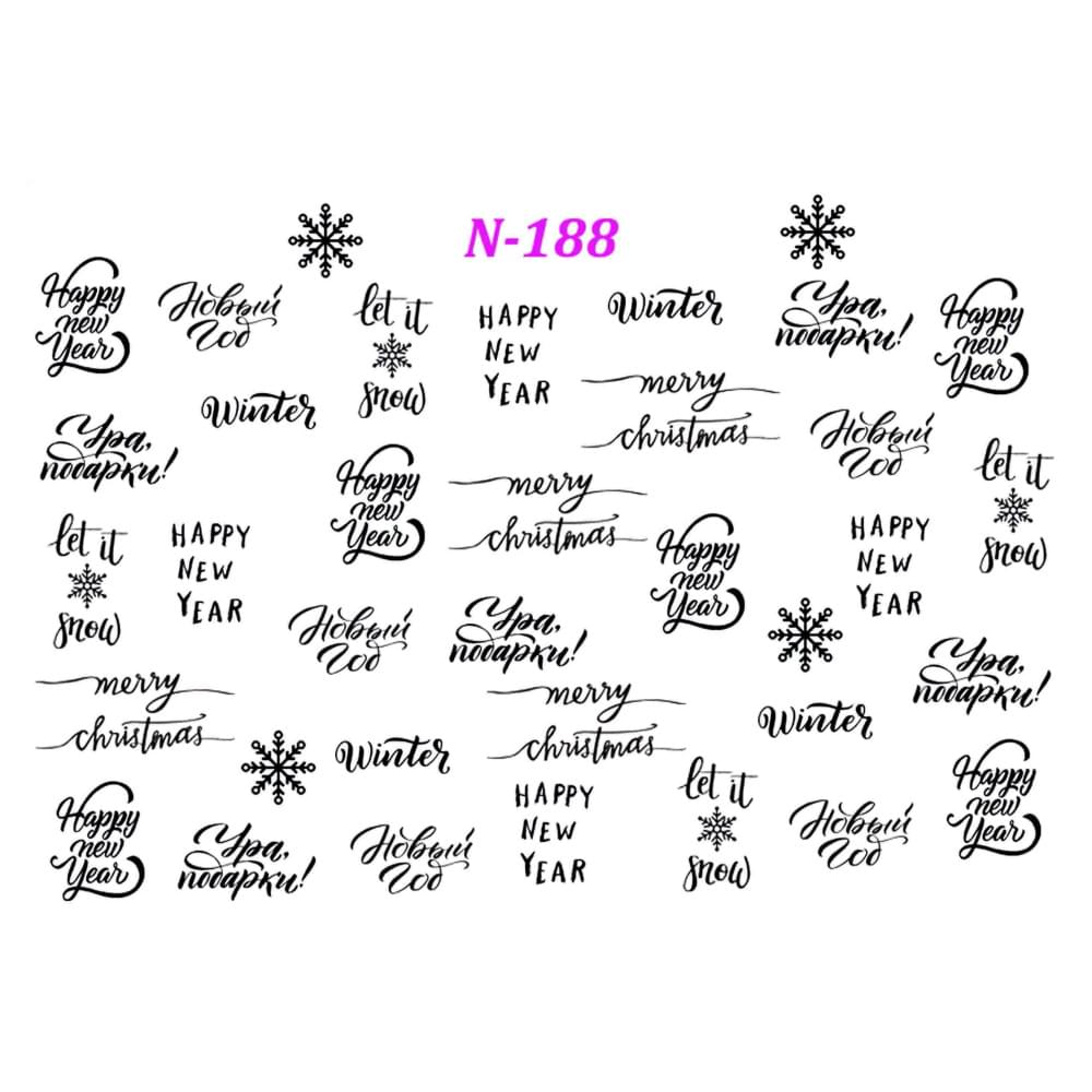 Новорічний нігтьовий дизайн з принтами завжди актуальний напередодні зимових свят і найкраще виглядає в поєднанні з контрастним фоном гель-лакового покриття. Такий нейл-арт нескладно виконати навіть в домашніх умовах. Достатньо всього лише придбати слайдер дизайн N188, який містить найбільш популярні новорічні фрази.