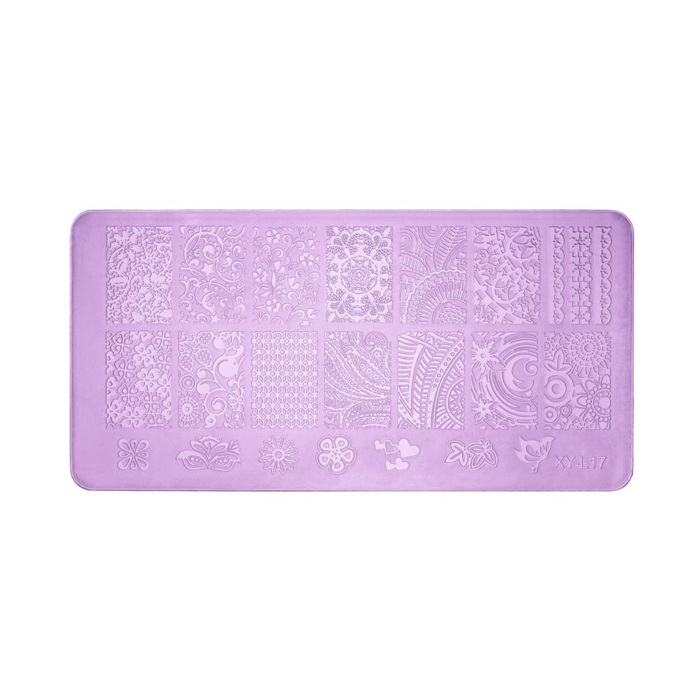KODI PROFESSIONAL пропонує багатий асортимент матеріалів для виконання дизайну в техніці стемпінг. Пластина для стемпінга L17 має розмір 6 х 12 см і виконана з міцного пластику фіолетового кольору. Дана пластина з якісним різьбленням містить 30 варіантів оригінальних візерунків довільної тематики.