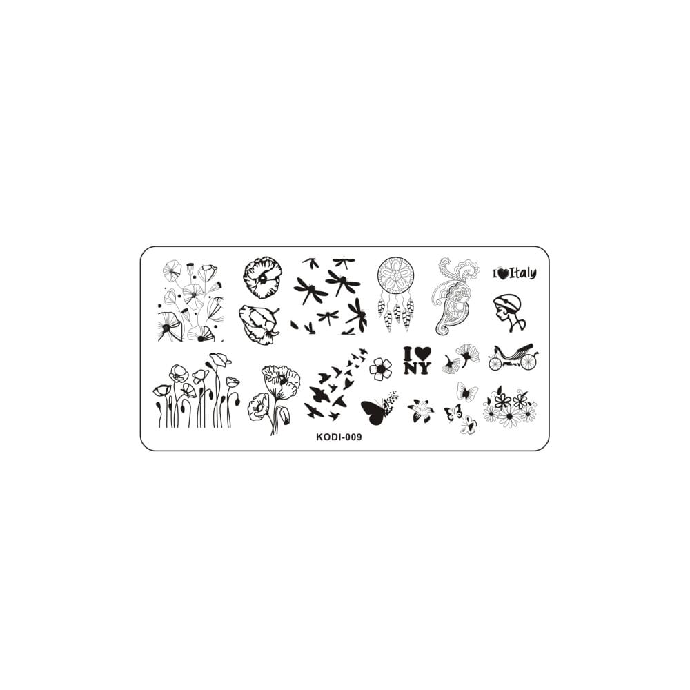 В асортименті KODI PROFESSIONAL широко представлені пластикові та металеві форми-трафарети. Металева пластина для стемпінга Kodi-009 об'єднує патерни і візерунки переважно природної тематики.